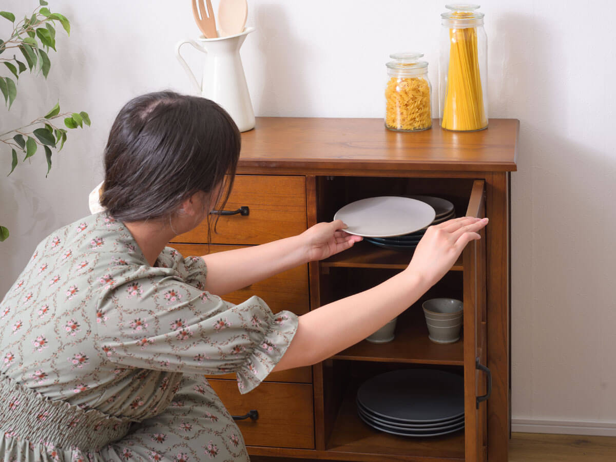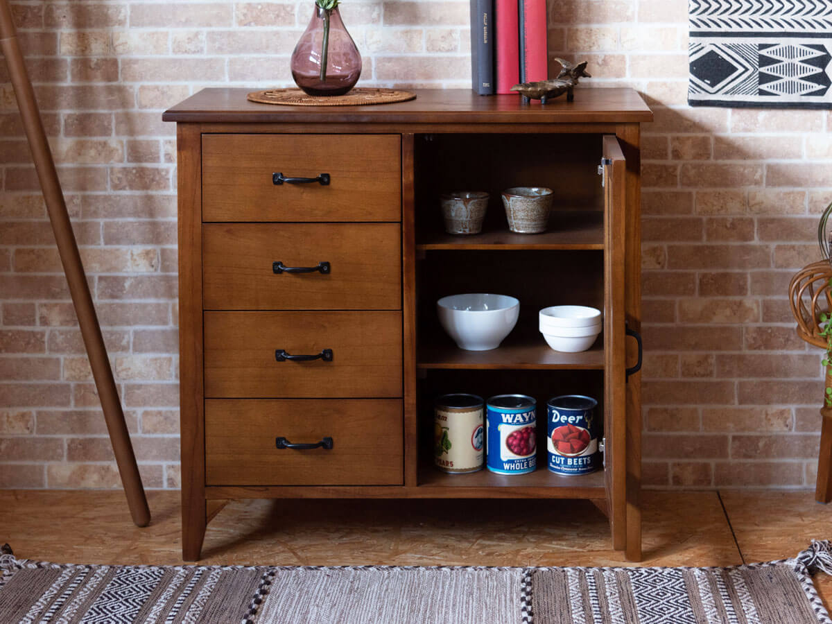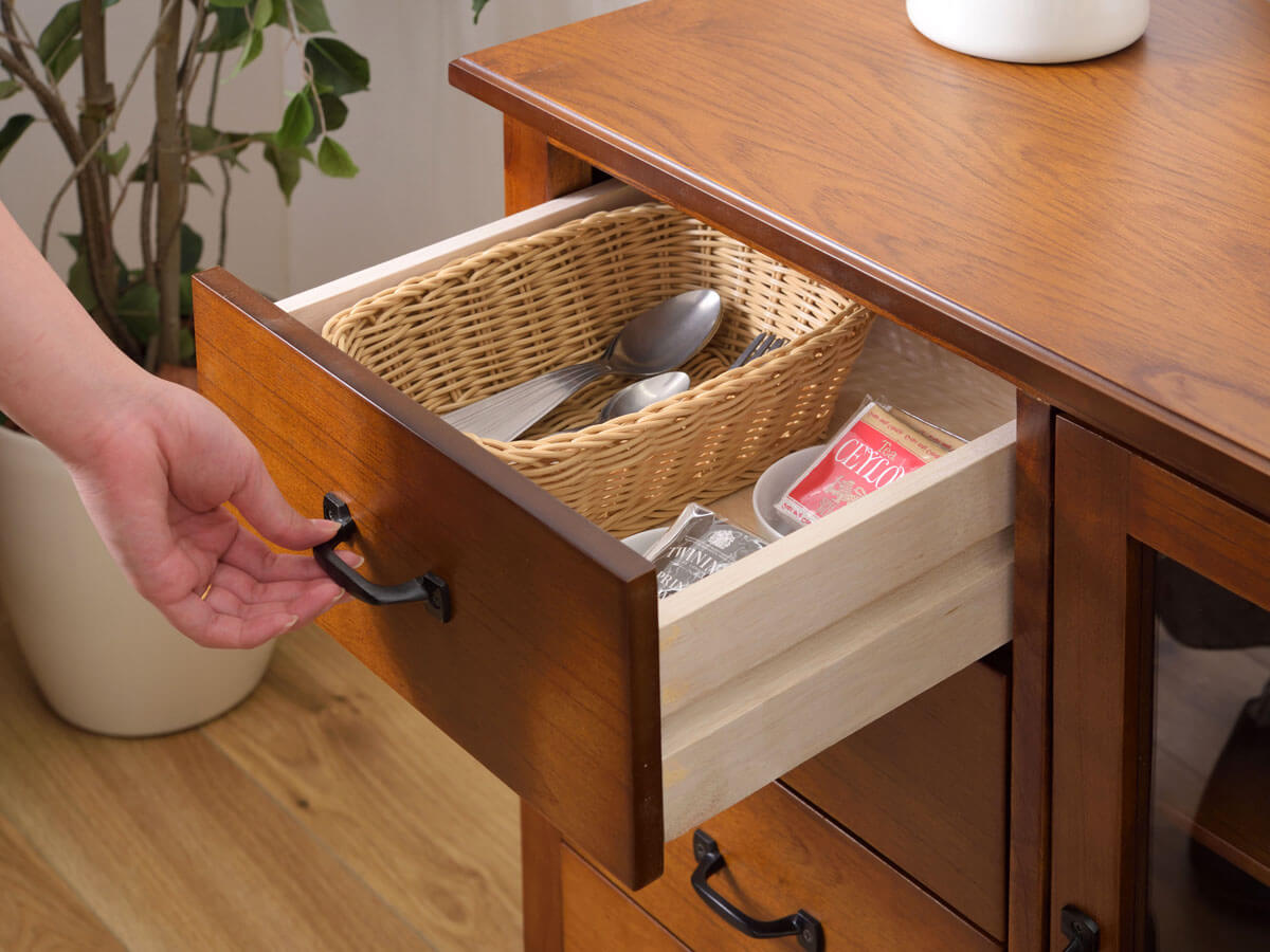 向かって左側は引き出し収納、右側はガラス扉の収納部分に分かれています。
