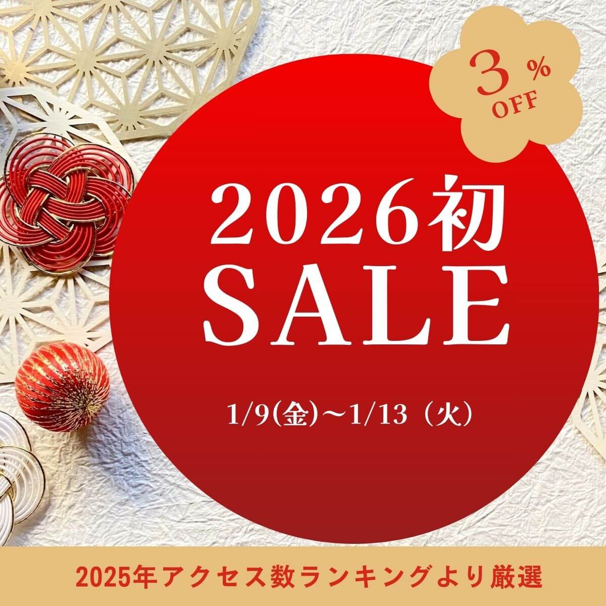 2026年初の期間限定セール実施します!13日(火)まで。2025年年間アクセス数ランキングベスト100から厳選商品をセール価格で販売します。現在の表示価格から3%OFFでお届けします!カートに入れるから最終画面でお値引き価格になりますので、ぜひこの機会をお見逃しなく。3%OFFですが最大約7,000円OFFになる商品もありますよ。