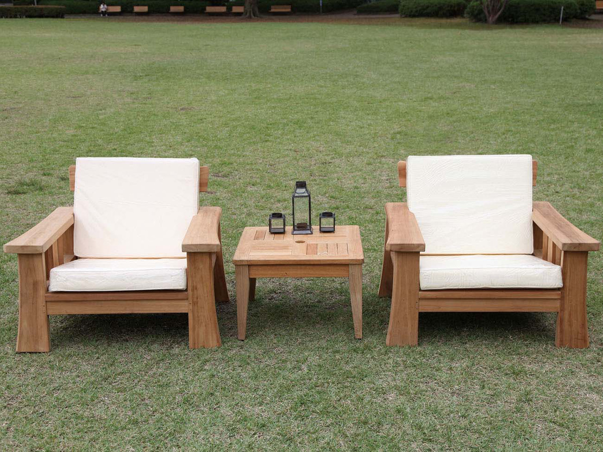 高級チークウッドを使用したカフェテーブル3点セットです。チェア2脚とテーブルの3点セットでのお届け致します。無塗装品なので屋内・屋外使用可能です。クッションは受注生産となります。ガーデンリフォームやアウトドア施設などお考えの方はおすすめです。