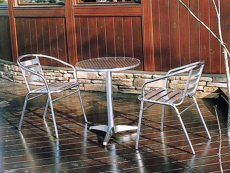 アルミテーブル3点Cセットです。アルミカフェテーブルとアルミチェア2脚をお届け致します。