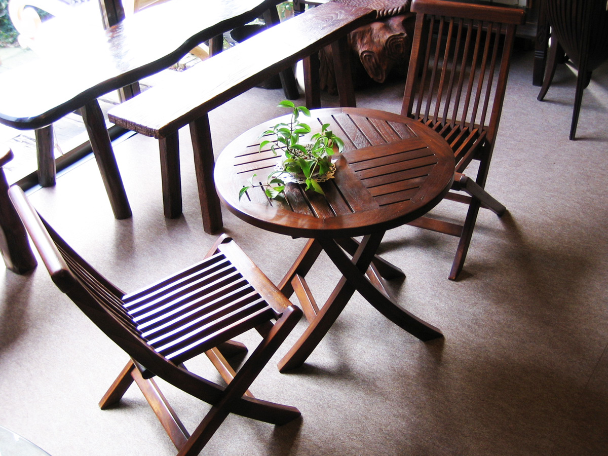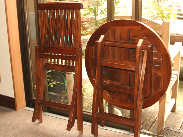 テーブルとチェア2脚の3点セットでお届けします。バリからの輸入家具。必要のないときは、コンパクトに折りたたんでおくことができます。ベランダや縁側等狭い場所にも最適なテーブルセットです。