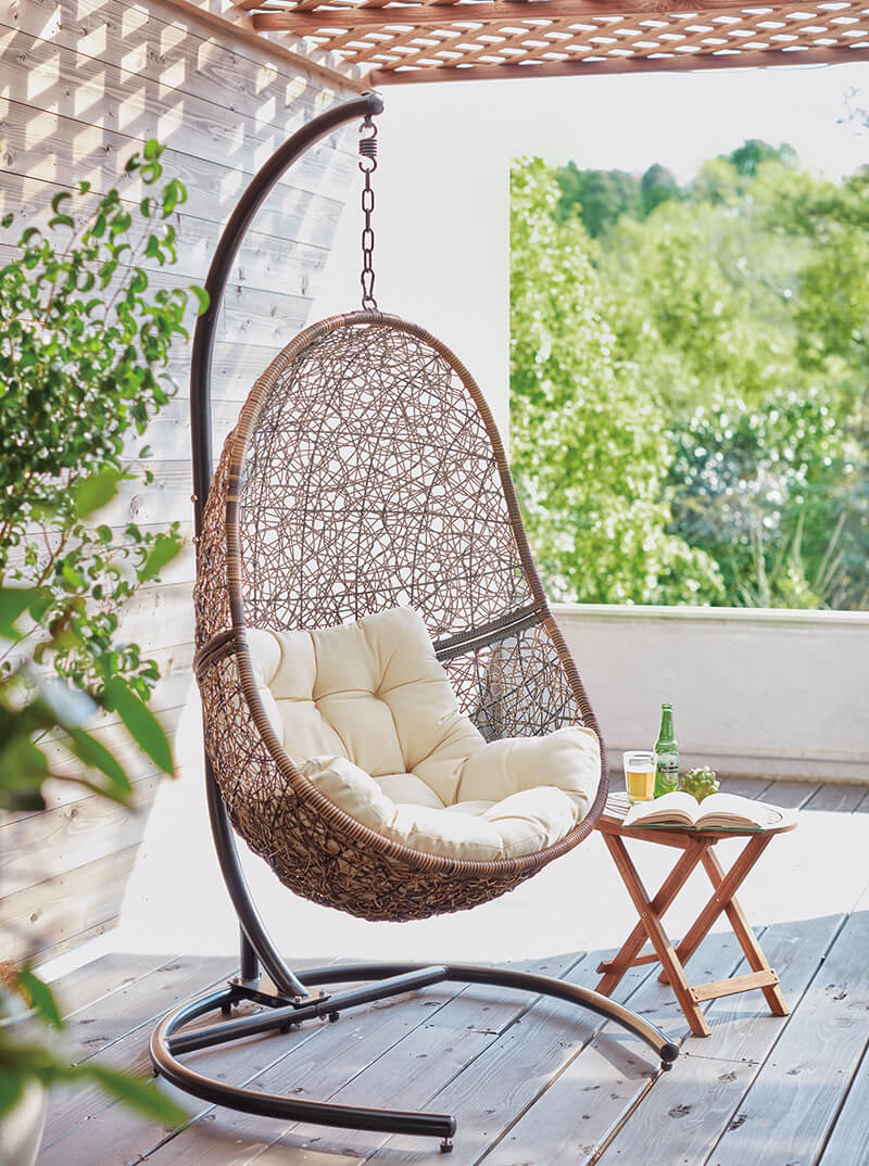 ガーデンテラスや屋外に置けるハンギングチェア。