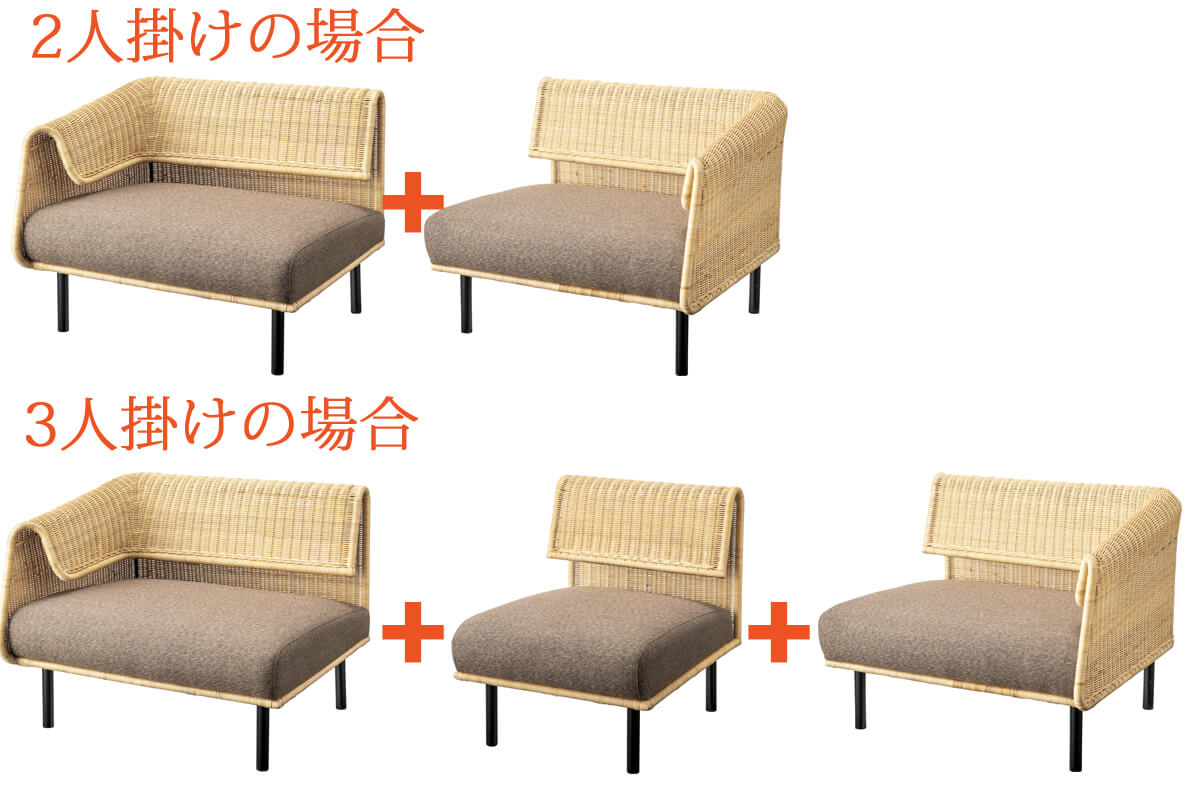 お部屋のレイアウトに合わせて配置変更可能です。センターソファを間に挟めばもっと幅広いソファもできますよ。