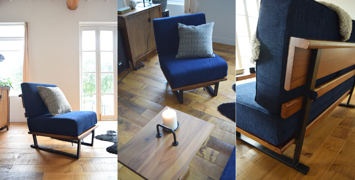 ヨーロッパの家具や楽器に使われる高級木材ミンディを土台に洗練されたスチール脚の2人掛けソファです。