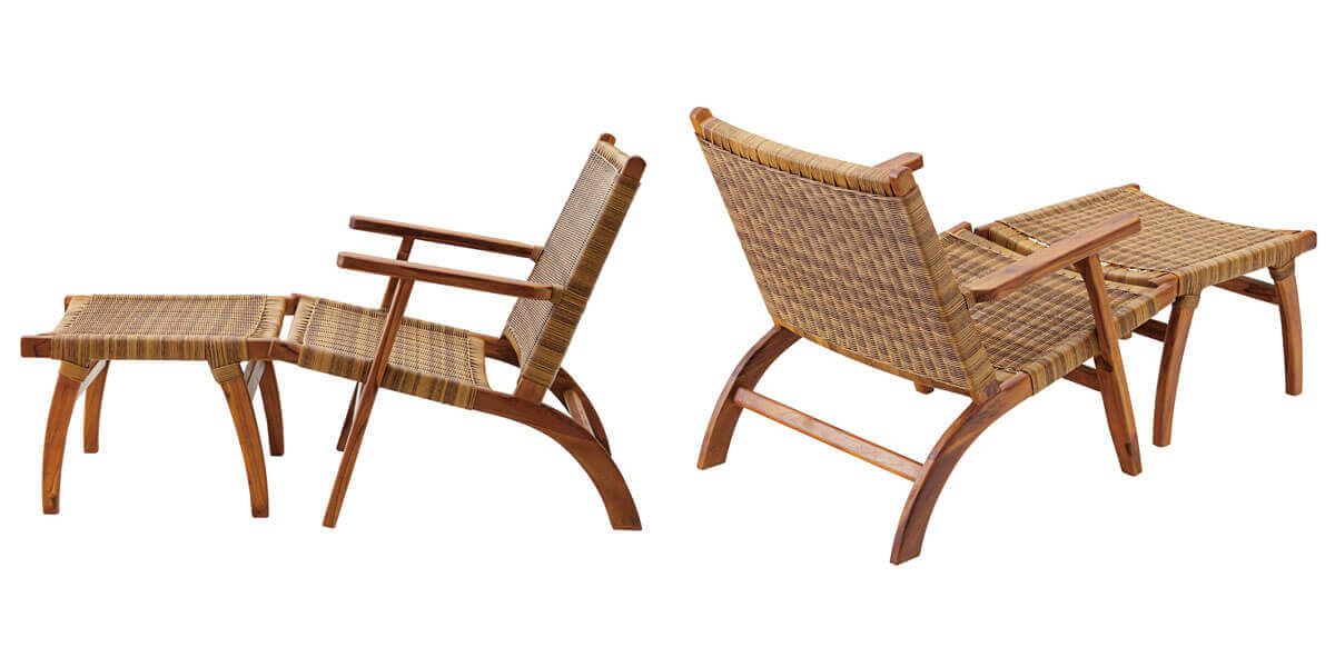 脚が伸ばせるチーク材のアームチェアとオットマン。