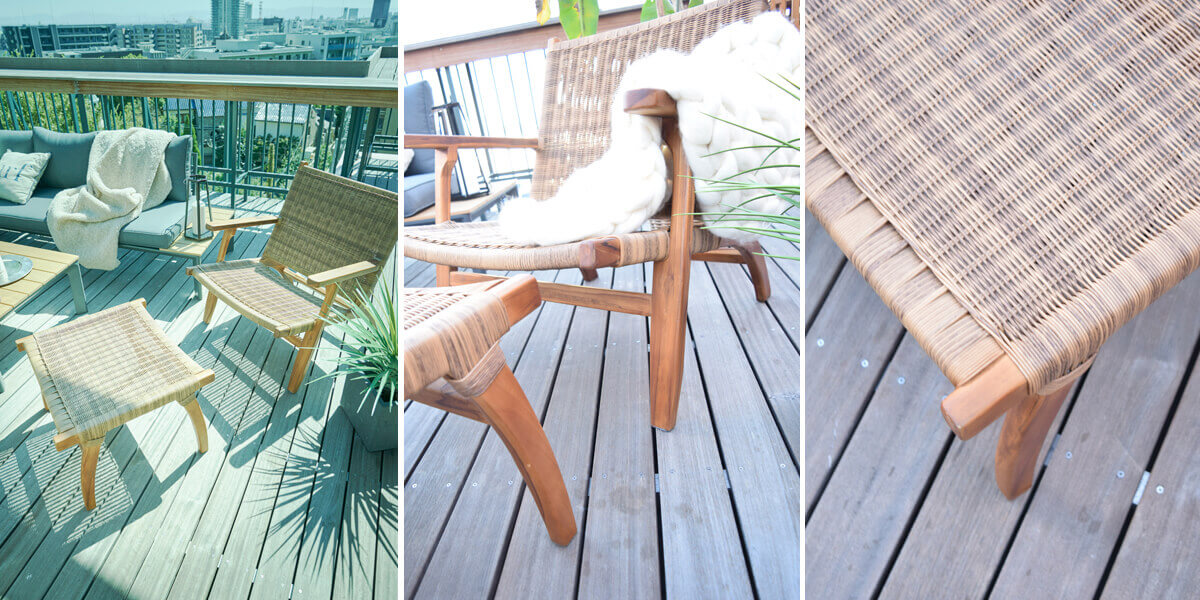 水、紫外線に強い!屋外で使用可能なポリエチレンと耐久性のあるチーク材を使ったガーデンファニチャーです。