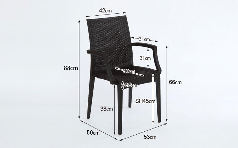 屋外で使える肘掛ありのガーデンチェアです。アーム付きなので、お庭やベランダ、テラスでのひと時を快適に過ごせます。人気のラタン編み込み風デザイン。プラスティック製なので、移動や持ち運びが楽です。