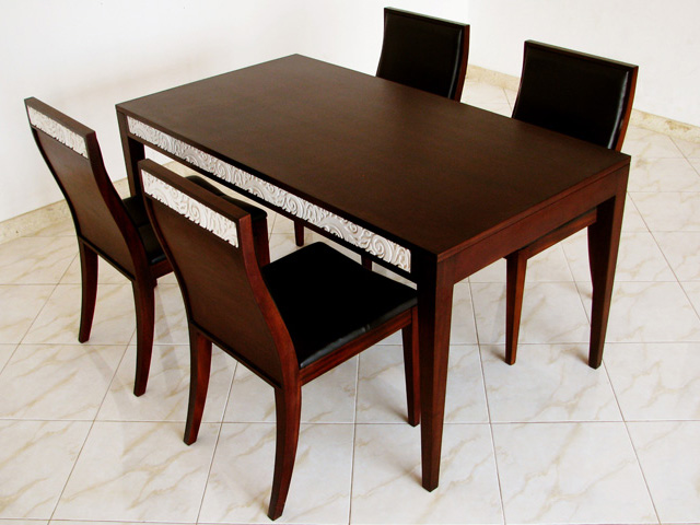 マホガニー材とストーン彫刻を組み合わせたダイニングテーブルセット。