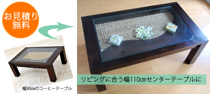 幅90cm×奥行60cm×高さ35cm、44,000円(税込み)コーヒーテーブルをソファと一緒に置ける幅110cm×奥行60cm×高さ45cmにサイズ変更。価格は76,900円(税込み)となりました。